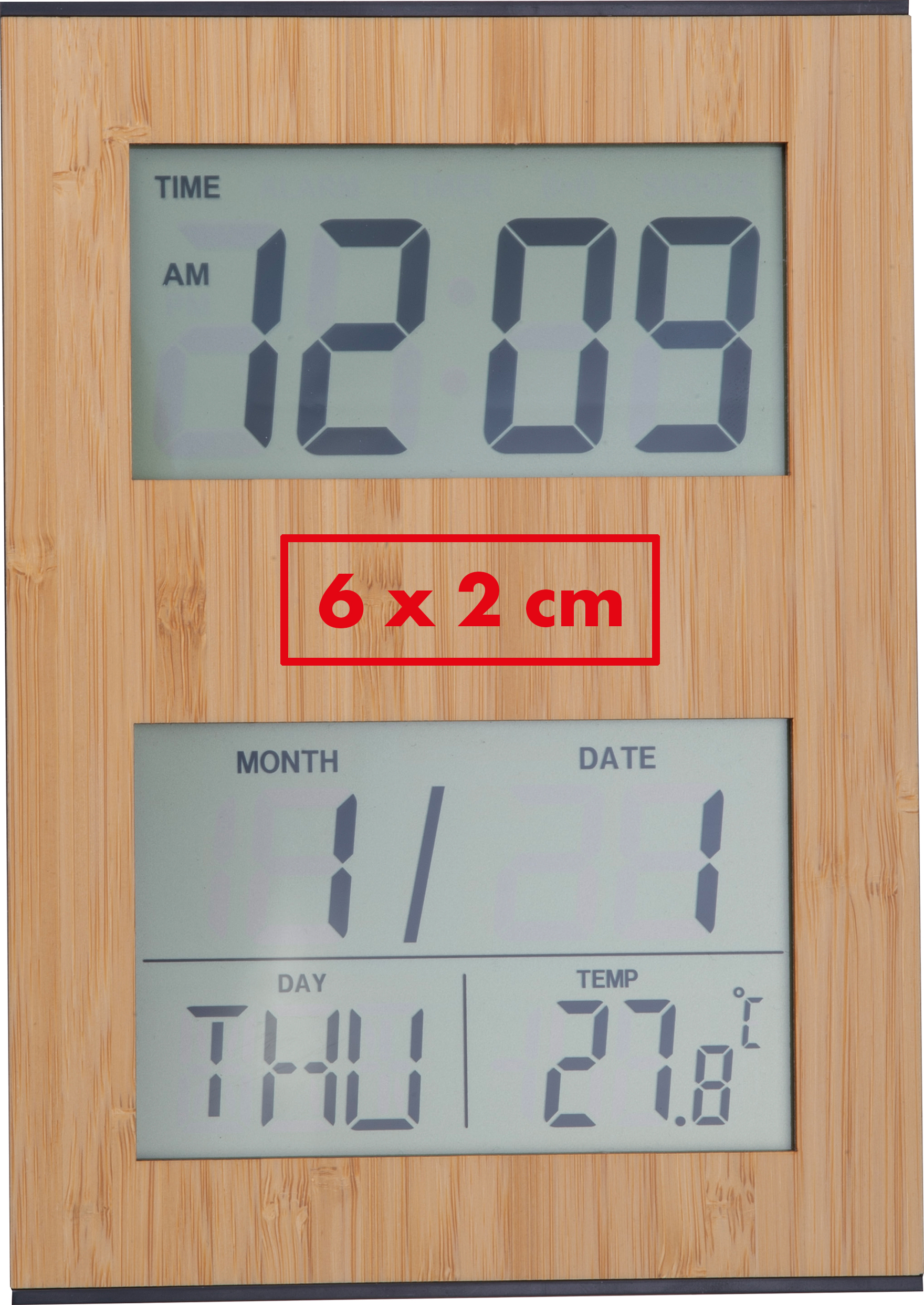 Bambus Tischuhr mit Anzeige von Uhrzeit, Datum und Temperatur. Das Gehäuse ist mit einer eleganten Bambusfront versehen und passt ideal auf jeden Schreibtisch oder Nachttisch.Unsere Bambus-Tischuhr mit Anzeige von Uhrzeit, Datum und Temperatur vereint Funktionalität mit natürlichem, modernem Design. Die elegante Bambusfront verleiht der Uhr eine warme, hochwertige Optik und macht sie zu einem stilvollen Blickfang auf jedem Schreibtisch oder Nachttisch. Dank der übersichtlichen Anzeige behalten Sie alle wichtigen Informationen auf einen Blick. Produkthighlights: Natürliche Bambusfront: Nachhaltig, edel und zeitlos im Design. Multifunktionsanzeige: Anzeige von Uhrzeit, Datum und Temperatur. Kompaktes Format: Ideal für Schreibtisch, Büro oder Nachttisch. Modern & dekorativ: Passt perfekt in Arbeits- und Wohnbereiche. Praktischer Alltagshelfer: Alle wichtigen Informationen übersichtlich dargestellt. Werbeanbringung: Ihre Werbung gravieren wir hochwertig auf die Bambusoberfläche – ideal als nachhaltiges Werbegeschenk oder stilvolles Büroaccessoire.