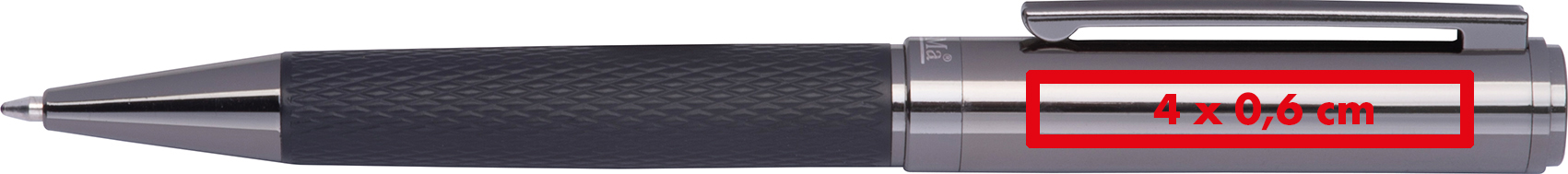 CrisMa Metallkugelschreiber mit gesmusteter Griffzone, blauschreibend, einer Schreiblänge von 1.200m und verpackt in einer Box mit Magnetschließe.Unser CrisMa Metallkugelschreiber mit gemusterter Griffzone steht für hochwertige Verarbeitung, elegantes Design und exzellenten Schreibkomfort. Die blauschreibende Mine mit einer Schreiblänge von ca. 1.200 Metern sorgt für ein gleichmäßiges Schriftbild und macht den Kugelschreiber zu einem zuverlässigen Begleiter im Berufsalltag. Geliefert wird er in einer edlen Box mit Magnetschließe – ideal als Geschenk oder hochwertiges Werbemittel. Produkthighlights: Hochwertiges Metallgehäuse: Robust, langlebig und mit edler Optik. Gemusterte Griffzone: Sorgt für sicheren Halt und angenehme Haptik beim Schreiben. Blaue Mine mit 1.200 m Schreiblänge: Langanhaltende Schreibqualität für den täglichen Einsatz. Edle Geschenkbox: Verpackt in einer hochwertigen Box mit Magnetschließe. Werbeanbringung: Ihr Logo gravieren wir hochwertig neben den Clip – perfekt als exklusives Werbegeschenk oder stilvolles Präsent.