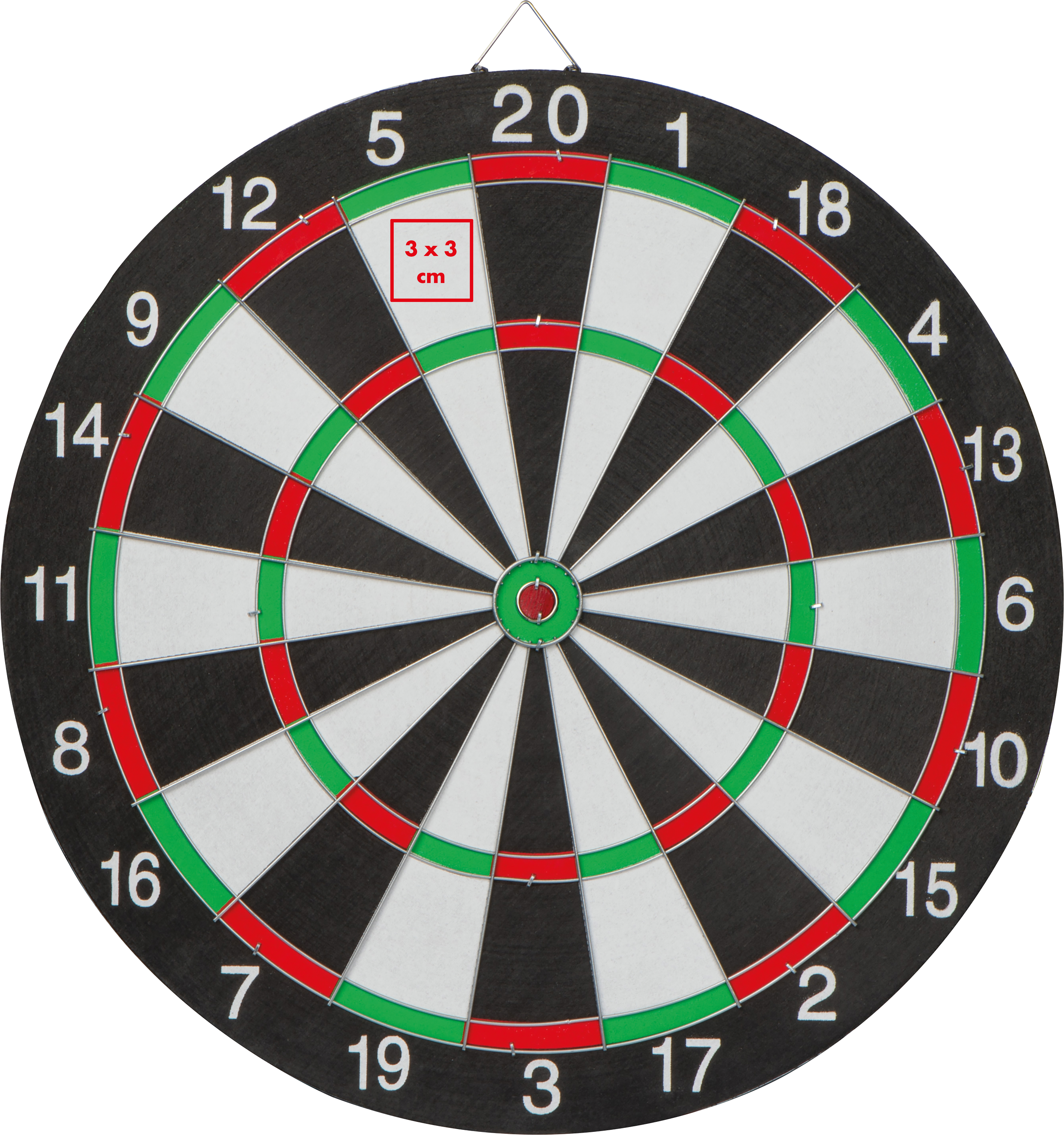 Beidseitig bespielbare Dartscheibe mit 6 Pfeilen und Metallschlaufe zum befestigen.