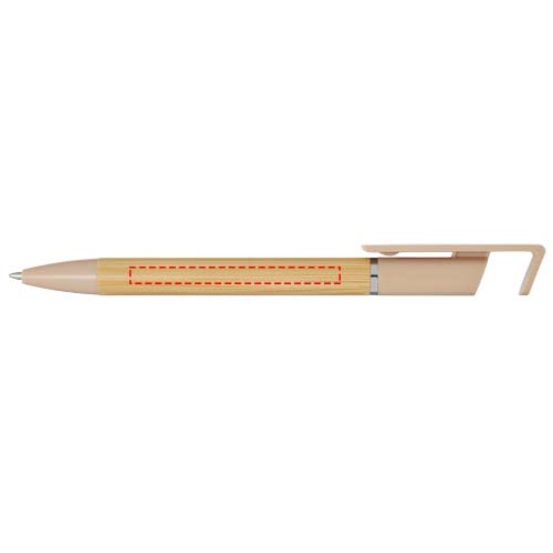 Delfina Stift Smartphoneständer (blaue Mine)Bamboo-Kugelschreiber, der auch als Telefonhalterung fungiert. Der Knopf und der Mittelring bestehen aus recyceltem Kunststoff, die Spitze aus Messing und der Schaft aus nachhaltig angebautem Bambus. Tintenfarbe: Blau. Schreiblänge: 1000 Meter. Strichstärke: 1,0 mm.