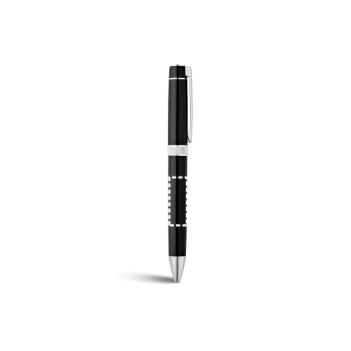 Set bestehend aus Rollerball und Kugelschreiber aus Metall mit Drehmechanismus und Clip. Schwarzschreibende Mine. Geliefert in einem gepolsterten Geschenketui