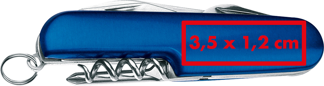 Edles 7 teiliges Aluminium-Taschenmesser mit großer Klinge, Dosen- und Flaschenöffner, Korkenzieher, Kreuz- und Schlitzschraubendreher und Schlüsselring.Unser edles 7-teiliges Aluminium-Taschenmesser ist ein vielseitiges Werkzeug mit einer hochwertigen Metallic-Lackierung. Es verfügt über eine große Klinge, einen Dosen- und Flaschenöffner, einen Korkenzieher, Kreuz- und Schlitzschraubendreher sowie einen praktischen Schlüsselring. Produkthighlights: Hochwertiges Aluminium: Das Taschenmesser besteht aus robustem Aluminium, was für Langlebigkeit und Stabilität sorgt. 7 praktische Werkzeuge: Das Messer bietet eine breite Palette von nützlichen Funktionen, darunter eine große Klinge, Dosen- und Flaschenöffner, Korkenzieher, Kreuz- und Schlitzschraubendreher sowie einen Schlüsselring. Metallic-Lackierung: Die Metallic-Lackierung verleiht dem Taschenmesser eine moderne und edle Optik. Werbeanbringung: Ihre Werbung wird mittig auf die Metallic-Lackierung gelasert, um Ihre Marke oder Ihr Logo präzise darzustellen.