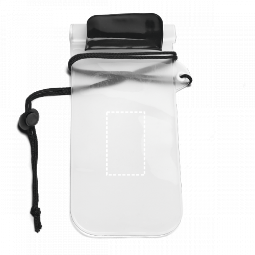 Handyhülle aus PVC mit einem verstellbarem Band mit Stopper, luftdichtem Verschluss und einer Lasche mit Klettverschluss. Die Vorderseite ist transparent und die Rückseite mattweiß. Diese Hülle ist wasserdicht und ermöglicht die Nutzung des Smartphones