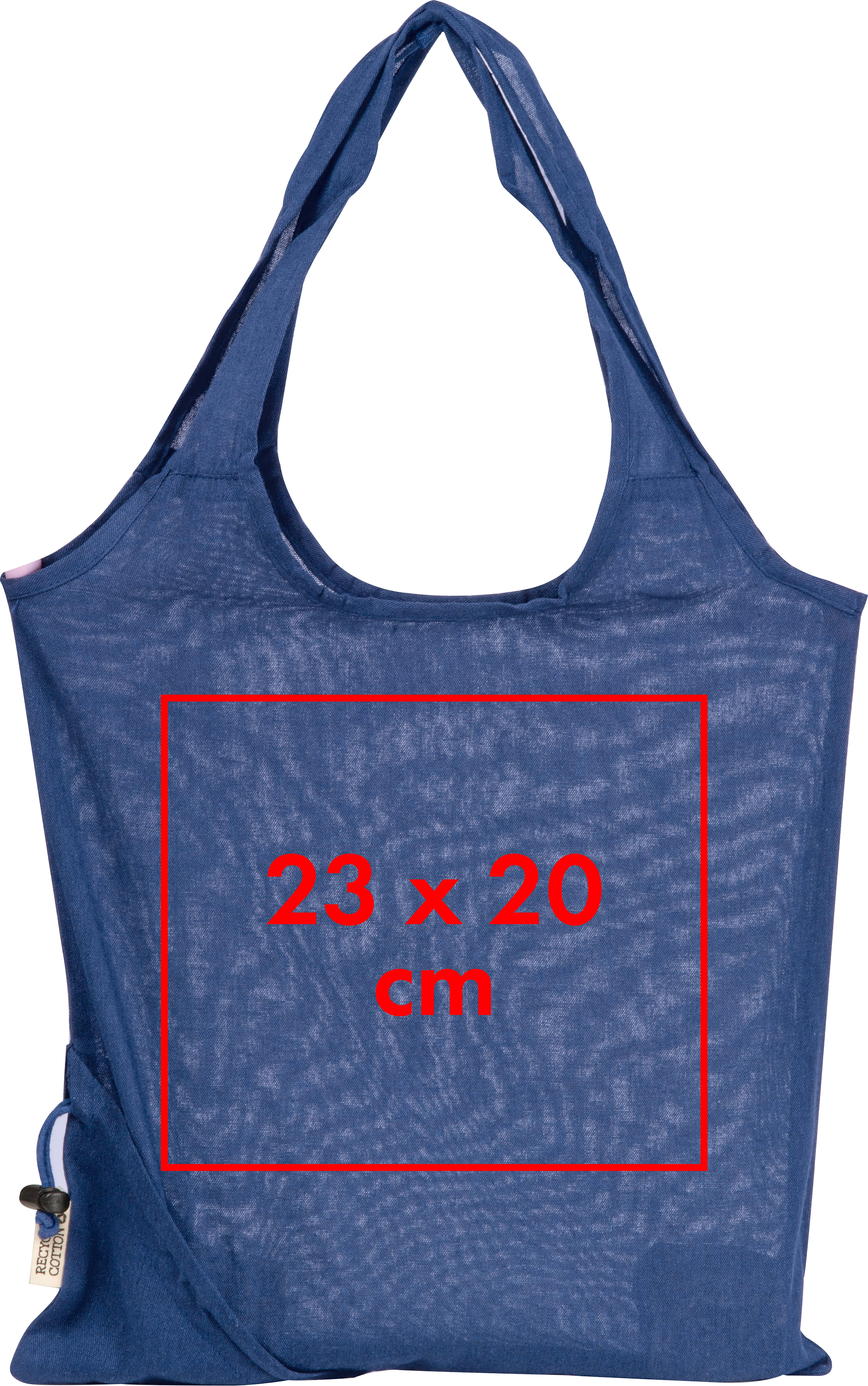 Einkaufstasche aus recycelter Baumwolle und Polyester mit einer Grammatur von 118 g/m². Die Tasche lässt sich platzsparend zusammenfalten.Unsere Einkaufstasche aus recycelter Baumwolle und Polyester ist eine praktische und platzsparende Lösung für den Alltag. Mit einer leichten Grammatur von 118 g/m² lässt sich die Tasche einfach zusammenfalten und bequem verstauen, wenn sie nicht in Gebrauch ist. Sie bietet ausreichend Platz für Einkäufe oder andere Gegenstände. Ihre Werbung wird gut sichtbar auf eine Seite der Tasche gedruckt, wodurch Ihre Marke stilvoll präsentiert wird. Produkthighlights: Recycelte Materialien: Aus Baumwolle und Polyester, leicht und strapazierfähig. Grammatur von 118 g/m²: Robuste Qualität bei geringem Gewicht. Platzsparend faltbar: Einfach zu verstauen, ideal für unterwegs. Geräumig: Bietet ausreichend Platz für Einkäufe oder Alltagsgegenstände. Werbeanbringung: Ihre Werbung wird auf eine Seite gedruckt und sorgt für eine professionelle und auffällige Markenpräsentation.