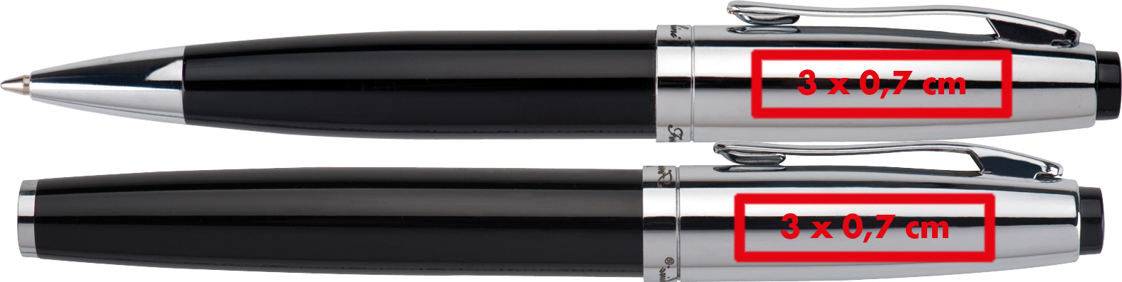 Ferraghini Schreibset aus Metall mit einem Drehkugelschreiber und einem Rollerball (beide blau schreibend) in schwarzer Klappbox.Das Ferraghini Schreibset aus Metall ist eine exquisite Kombination von Eleganz und Funktionalität. Dieses Set beinhaltet einen Drehkugelschreiber und einen Rollerball, beide mit blauer Tinte, präsentiert in einer eleganten schwarzen Klappbox. Um Ihre Marke hervorzuheben, wird Ihr Logo rechts vom Clip auf beiden Schreibgeräten mittels Lasergravur angebracht. Die Laserkosten gelten für beide Schreibgeräte. Produkthighlights: Hochwertiges Metall: Die Schreibgeräte sind aus hochwertigem Metall gefertigt, was ihnen nicht nur ein edles Aussehen verleiht, sondern auch Langlebigkeit und Stabilität garantiert. Kugelschreiber und Rollerball: Das Set umfasst einen Drehkugelschreiber und einen Rollerball, beide mit blauer Tinte, für eine reibungslose Schreiberfahrung. Elegante Klappbox: Die Schreibgeräte werden in einer stilvollen schwarzen Klappbox präsentiert, die nicht nur den Schutz der Stifte gewährleistet, sondern auch eine ansprechende Präsentation ermöglicht. Werbeanbringung: Ihr Logo wird auf beiden Schreibgeräten rechts vom Clip mittels Lasergravur angebracht, um sie zu personalisieren und Ihre Marke subtil in den Mittelpunkt zu stellen.