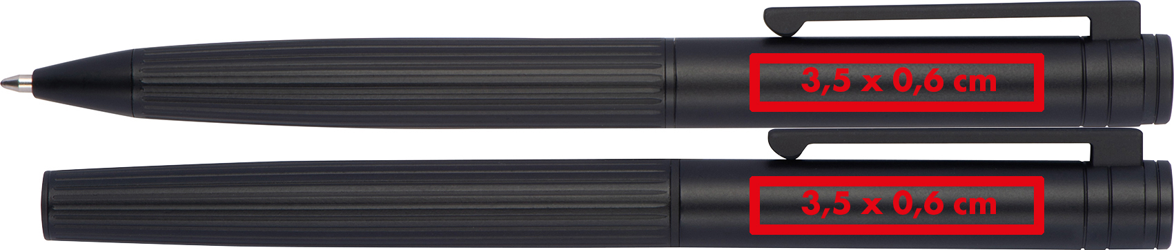Herzlich willkommen zu unserem exklusiven Ferraghini Schreibset – eine hochwertige Kombination aus einem Kugelschreiber und einem Rollerball aus Metall mit geriffelter Oberfläche! Beide Schreibgeräte sind mit blauer Schreibfarbe ausgestattet. Produkthighlights: Hochwertiges Metall: Beide Schreibgeräte bestehen aus hochwertigem Metall, was für Langlebigkeit und Eleganz sorgt. Geriffelte Oberfläche: Die geriffelte Oberfläche verleiht den Schreibgeräten eine moderne Optik und eine angenehme Haptik. Kugelschreiber und Rollerball: Das Set besteht aus einem Kugelschreiber und einem Rollerball, um verschiedene Schreiberlebnisse zu bieten. Blaue Schreibfarbe: Beide Schreibgeräte sind mit blauer Schreibfarbe ausgestattet, um ein angenehmes Schreiberlebnis zu gewährleisten. Werbeanbringung: Ihr Logo wird auf beiden Schreibgeräten neben dem Clip graviert, um eine auffällige und personalisierte Präsentation zu gewährleisten.