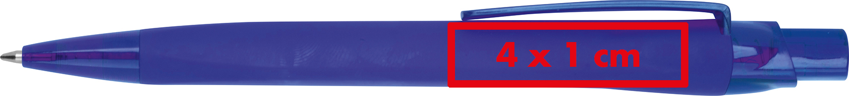 Gummierter Kugelschreiber aus Kunststoff mit blau schreibender Großraummine (Schreiblänge ca. 800m).