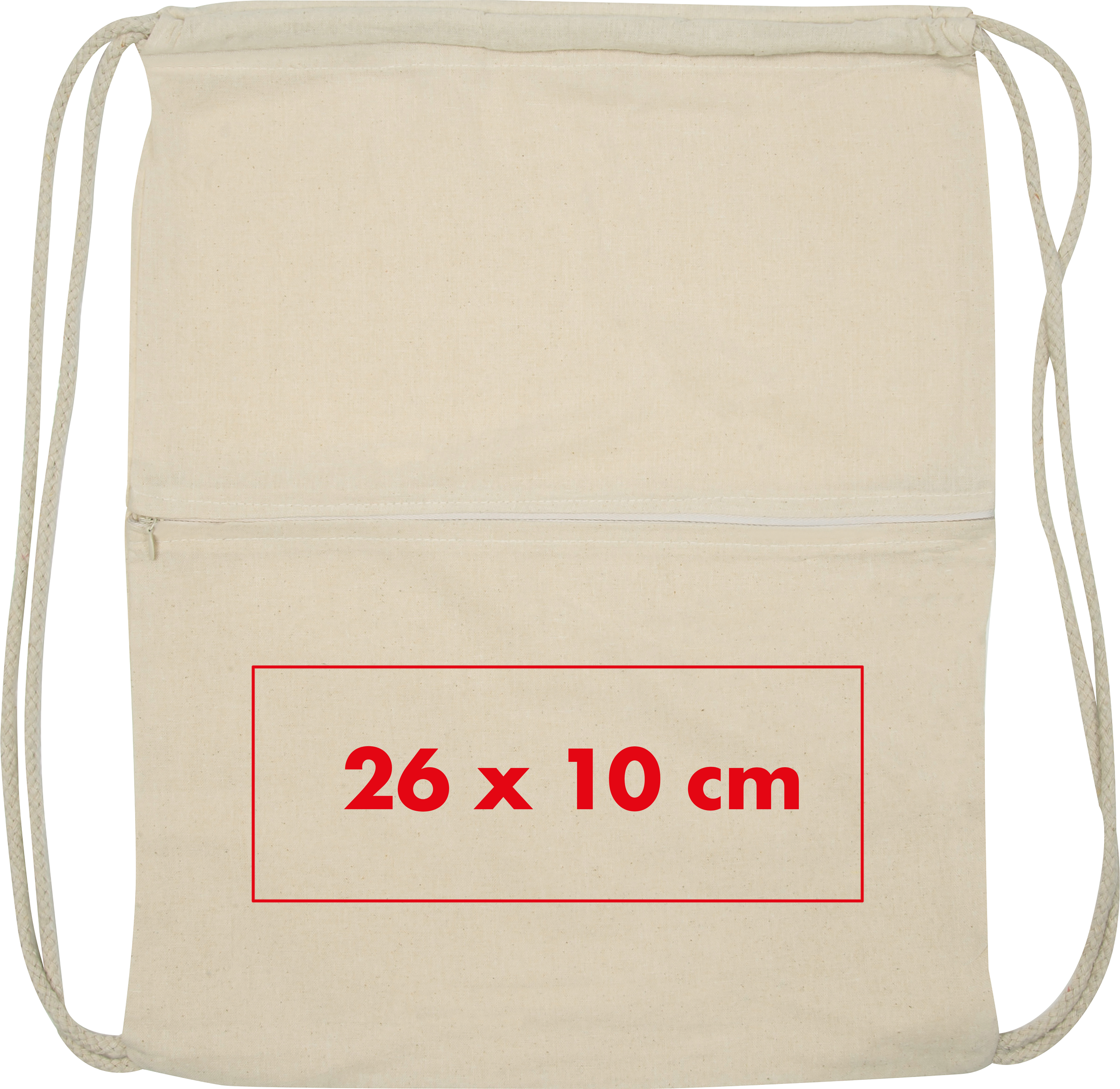 Oeko-Tex® STANDARD 100 zertifizierter Gymbag aus naturfarbener Baumwolle (140g/m²) mit verschliessbarem Vorfach.Unser hochwertiger Gymbag aus Baumwolle ist die perfekte Kombination aus Funktionalität und Stil. Dank des praktischen Designs mit zusätzlichem Stauraum und zertifizierter Qualität ist er ideal für Sport, Freizeit und den täglichen Gebrauch. Produkthighlights: Robustes Material: Hergestellt aus naturfarbener Baumwolle mit einer Grammatur von 140g/m², bietet der Gymbag eine langlebige und zuverlässige Nutzung. Zertifizierte Qualität: Die Oeko-Tex® STANDARD 100 Zertifizierung garantiert, dass der Gymbag den höchsten Qualitäts- und Sicherheitsstandards entspricht. Verschließbares Vorfach: Das Vorfach bietet zusätzlichen Platz für kleine Gegenstände und kann sicher verschlossen werden, um diese optimal zu schützen. Vielseitiger Einsatz: Perfekt für den Sport, Freizeitaktivitäten oder als leichter Alltagsbegleiter. Werbeanbringung: Ihr Logo wird prominent auf dem Vorfach platziert, um eine optimale Sichtbarkeit Ihrer Marke zu gewährleisten.
