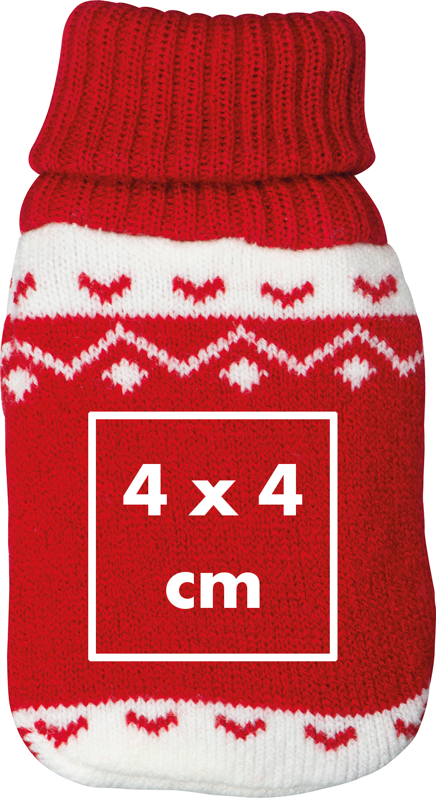 Handwärmer mit kuscheligem Stricküberzug und Weihnachtsmotiv. Die Wärme entwickelt sich durch einfaches Drücken auf dem Metallplättchen und sorgt so für wohlig warme Hände.Unser Handwärmer mit kuscheligem Stricküberzug und Weihnachtsmotiv ist das perfekte Accessoire für kalte Wintertage. Mit nur einem Knopfdruck entfaltet sich angenehme Wärme, die Ihre Hände wohlig warm hält. Der dekorative Stricküberzug mit festlichem Motiv verleiht dem Handwärmer eine charmante Optik. Ihre individuelle Werbung wird direkt auf den Stricküberzug gedruckt und macht diesen Handwärmer zu einem stilvollen und effektiven Werbeartikel. Produkthighlights: Schnelle Wärme: Aktiviert durch Drücken, ideal für unterwegs oder als Geschenk. Kuscheliger Stricküberzug: Weich und angenehm mit einem festlichen Weihnachtsmotiv. Wiederverwendbar: Einfach im heißen Wasser reaktivieren und immer wieder verwenden. Kompakte Größe: Perfekt für Jackentaschen oder Handschuhe. Werbeanbringung: Ihre Werbung wird direkt auf den Stricküberzug gedruckt und sorgt für eine sichtbare Markenpräsentation.