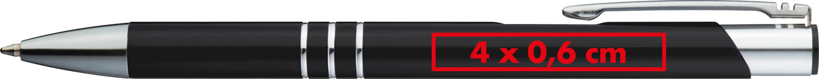 Eloxierter Kugelschreiber aus Metall mit 3 Zierringen und blau schreibender Großraummine.Unser eloxierter Kugelschreiber aus Metall mit 3 Zierringen und blau schreibender Großraummine ist eine stilvolle Schreiboption. Ihre Werbung wird rechts vom Clip des Kugelschreibers gelasert, um Ihre Marke auf elegante Weise zu präsentieren. Produkthighlights: Hochwertiges Metall: Der Kugelschreiber besteht aus eloxiertem Metall, was ihm eine edle Optik und Langlebigkeit verleiht. Blauschreibende Großraummine: Die blaue Großraummine bietet ein geschmeidiges Schreiberlebnis und sorgt für klare und gestochen scharfe Schrift. Drei Zierringe: Die drei Zierringe am Schaft des Kugelschreibers verleihen ihm eine elegante und zeitlose Optik. Werbeanbringung: Ihre Werbung wird rechts vom Clip des Kugelschreibers gelasert, um sicherzustellen, dass Ihre Marke stilvoll und dauerhaft präsentiert wird.