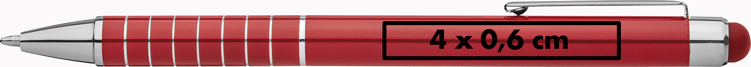 Drehkugelschreiber aus Metall mit farblich abgestimmtem Touch-Pad, blau schreibender Mine und 8 Zierringen.Unser Metall-Drehkugelschreiber mit Touch-Pad ist nicht nur ein praktisches Schreibinstrument, sondern auch ein stilvolles Accessoire. Mit Ihrer Lasergravur wird er zu einem individuellen Werbemittel, das Kunden und Geschäftspartner gleichermaßen beeindrucken wird. Bestellen Sie noch heute diesen eleganten Kugelschreiber und setzen Sie Ihre Marke stilvoll in Szene. Produkthighlights: Hochwertiges Metall: Der Kugelschreiber ist aus hochwertigem Metall gefertigt, was ihm eine robuste und langlebige Qualität verleiht. Touch-Pad: Das integrierte Touch-Pad in passender Farbe ermöglicht es Ihnen, problemlos auf Touchscreen-Geräten zu navigieren. Blaue Großraummine: Mit einer blau schreibenden Großraummine ist dieser Stift perfekt für den täglichen Gebrauch geeignet. Stilvolles Design: Acht Zierringe verleihen dem Stift ein modernes und elegantes Erscheinungsbild. Werbeanbringung: Ihr Logo wird rechts vom Clip per Lasergravur angebracht, was eine dauerhafte und stilvolle Markenpräsentation gewährleistet.