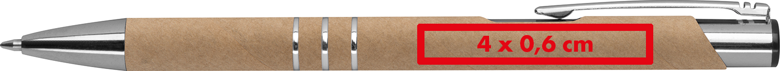 Unser Kugelschreiber aus recyceltem Papier ist ein praktisches und stilvolles Schreibgerät. Mit Ihrem gedruckten Logo auf dem Schaft wird er zu einem individuellen und hochwertigen Werbegeschenk. Produkthighlights: Recyceltes Papier: Der Schaft des Kugelschreibers besteht aus recyceltem Papier, was ihm eine natürliche und moderne Optik verleiht. Dreifache Zierringe: Die drei Zierringe am Schaft unterstreichen das ansprechende und elegante Design. Blau schreibende Großraummine: Die blaue Großraummine sorgt für ein sauberes und zuverlässiges Schriftbild. Werbeanbringung: Ihr Logo wird präzise auf dem Schaft des Kugelschreibers gedruckt, was ihn zu einem persönlichen und effektiven Werbemittel macht.