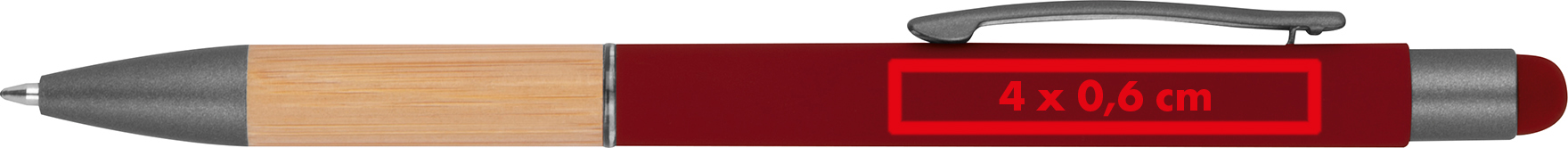 Kugelschreiber aus Aluminium mit blau schreibender Mine, Touchfunktion, matten, silbernen Applikationen und einer Griffzone aus Bambus.Unser Aluminium-Kugelschreiber vereint modernes Design mit praktischen Funktionen. Der elegante Aluminiumkörper wird durch eine Griffzone aus natürlichem Bambus ergänzt, die nicht nur angenehm in der Hand liegt, sondern auch einen stilvollen Kontrast bietet. Die blaue Schreibmine sorgt für ein geschmeidiges Schreiberlebnis, während die integrierte Touchfunktion den Kugelschreiber zu einem vielseitigen Begleiter macht. Ihre Werbung wird rechts vom Clip graviert und hebt Ihre Marke dezent und hochwertig hervor. Produkthighlights: Aluminiumkörper: Langlebig, leicht und mit einem modernen Look. Bambus-Griffzone: Natürliche Akzente für einen angenehmen Griff und stilvolle Optik. Blau schreibende Mine: Sorgt für präzises und flüssiges Schreiben. Integrierte Touchfunktion: Perfekt für die Nutzung von Smartphones und Tablets. Werbeanbringung: Ihr Logo oder Ihre Botschaft wird rechts vom Clip graviert, für eine dezente und professionelle Präsentation Ihrer Marke.