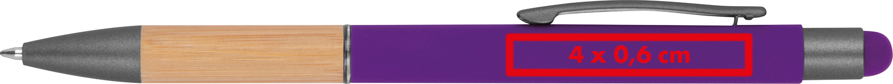 Kugelschreiber aus Aluminium mit blau schreibender Mine, Touchfunktion, matten, silbernen Applikationen und einer Griffzone aus Bambus.Unser Aluminium-Kugelschreiber vereint modernes Design mit praktischen Funktionen. Der elegante Aluminiumkörper wird durch eine Griffzone aus natürlichem Bambus ergänzt, die nicht nur angenehm in der Hand liegt, sondern auch einen stilvollen Kontrast bietet. Die blaue Schreibmine sorgt für ein geschmeidiges Schreiberlebnis, während die integrierte Touchfunktion den Kugelschreiber zu einem vielseitigen Begleiter macht. Ihre Werbung wird rechts vom Clip graviert und hebt Ihre Marke dezent und hochwertig hervor. Produkthighlights: Aluminiumkörper: Langlebig, leicht und mit einem modernen Look. Bambus-Griffzone: Natürliche Akzente für einen angenehmen Griff und stilvolle Optik. Blau schreibende Mine: Sorgt für präzises und flüssiges Schreiben. Integrierte Touchfunktion: Perfekt für die Nutzung von Smartphones und Tablets. Werbeanbringung: Ihr Logo oder Ihre Botschaft wird rechts vom Clip graviert, für eine dezente und professionelle Präsentation Ihrer Marke.
