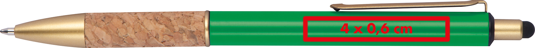 Kugelschreiber aus Metall mit goldenen Applikationen, blau schreibender Mine und Griffzone aus Kork.Unser Kugelschreiber aus Metall verbindet stilvolle Eleganz mit einem besonderen Schreibkomfort und einem ansprechenden Design. Produkthighlights: Hochwertiges Metall: Das Metallgehäuse sorgt für eine edle Optik und hohe Langlebigkeit. Blau schreibende Mine: Die Mine bietet ein präzises, flüssiges Schreibgefühl, ideal für den täglichen Gebrauch. Griffzone aus Kork: Die Korkgriffzone liegt angenehm in der Hand und verleiht dem Kugelschreiber eine besondere Haptik. Goldene Applikationen: Luxuriöse Akzente, die den Kugelschreiber zu einem echten Blickfang machen. Werbeanbringung: Ihr Logo wird rechts vom Clip präzise graviert, um dem Kugelschreiber eine individuelle Note zu verleihen und Ihre Marke stilvoll hervorzuheben.