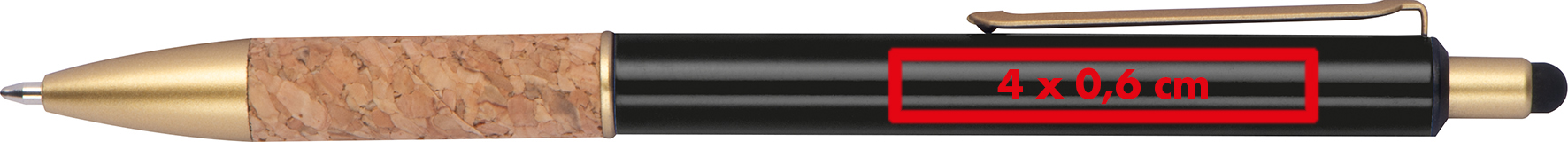 Kugelschreiber aus Metall mit goldenen Applikationen, blau schreibender Mine und Griffzone aus Kork.Unser Kugelschreiber aus Metall verbindet stilvolle Eleganz mit einem besonderen Schreibkomfort und einem ansprechenden Design. Produkthighlights: Hochwertiges Metall: Das Metallgehäuse sorgt für eine edle Optik und hohe Langlebigkeit. Blau schreibende Mine: Die Mine bietet ein präzises, flüssiges Schreibgefühl, ideal für den täglichen Gebrauch. Griffzone aus Kork: Die Korkgriffzone liegt angenehm in der Hand und verleiht dem Kugelschreiber eine besondere Haptik. Goldene Applikationen: Luxuriöse Akzente, die den Kugelschreiber zu einem echten Blickfang machen. Werbeanbringung: Ihr Logo wird rechts vom Clip präzise graviert, um dem Kugelschreiber eine individuelle Note zu verleihen und Ihre Marke stilvoll hervorzuheben.