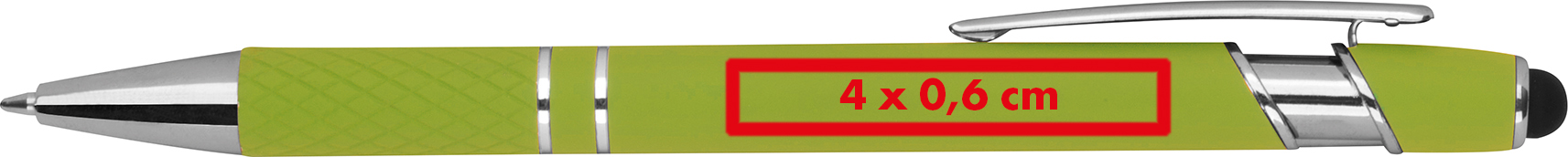 Kugelschreiber aus Aluminium mit silbernen Applikationen, blau schreibender Großraummine, Touchfunktion und gemusterter Griffzone.Unser Aluminium-Kugelschreiber ist ein exklusives Schreibgerät, das nicht nur hervorragende Schreibergebnisse liefert, sondern auch stilvoll und funktional ist. Produkthighlights: Hochwertiges Aluminium: Dieser Kugelschreiber ist aus hochwertigem Aluminium gefertigt, was ihm ein elegantes und modernes Erscheinungsbild verleiht. Blau schreibende Mine: Die blau schreibende Mine sorgt für ein reibungsloses und präzises Schreibgefühl, das in Meetings, im Büro oder unterwegs ideal ist. Touchfunktion: Die integrierte Touchfunktion ermöglicht die bequeme Bedienung von Touchscreens auf Smartphones und Tablets. Gemusterte Griffzone: Die gemusterte Griffzone sorgt für einen rutschfesten Halt und ein angenehmes Schreibgefühl. Silberne Applikationen: Silberne Applikationen verleihen dem Kugelschreiber eine stilvolle Note. Werbeanbringung: Ihr Logo wird rechts neben dem Clip auf den Kugelschreiber graviert, was ihm eine persönliche Note verleiht und ihn zu einem einzigartigen Werbemittel oder Geschenk macht.
