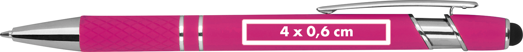 Kugelschreiber aus Aluminium mit silbernen Applikationen, blau schreibender Großraummine, Touchfunktion und gemusterter Griffzone.Unser Aluminium-Kugelschreiber ist ein exklusives Schreibgerät, das nicht nur hervorragende Schreibergebnisse liefert, sondern auch stilvoll und funktional ist. Produkthighlights: Hochwertiges Aluminium: Dieser Kugelschreiber ist aus hochwertigem Aluminium gefertigt, was ihm ein elegantes und modernes Erscheinungsbild verleiht. Blau schreibende Mine: Die blau schreibende Mine sorgt für ein reibungsloses und präzises Schreibgefühl, das in Meetings, im Büro oder unterwegs ideal ist. Touchfunktion: Die integrierte Touchfunktion ermöglicht die bequeme Bedienung von Touchscreens auf Smartphones und Tablets. Gemusterte Griffzone: Die gemusterte Griffzone sorgt für einen rutschfesten Halt und ein angenehmes Schreibgefühl. Silberne Applikationen: Silberne Applikationen verleihen dem Kugelschreiber eine stilvolle Note. Werbeanbringung: Ihr Logo wird rechts neben dem Clip auf den Kugelschreiber graviert, was ihm eine persönliche Note verleiht und ihn zu einem einzigartigen Werbemittel oder Geschenk macht.