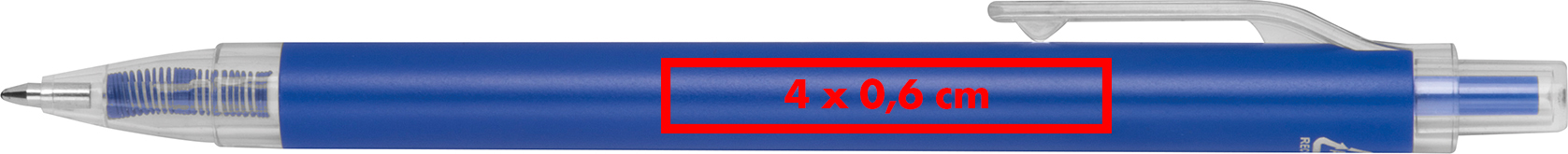 Kugelschreiber aus recyceltem Aluminium und recyceltem Kunststoff (RPET), mit transparentem Clip und blau schreibender Großraummine.