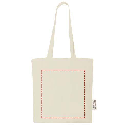 Madras 140 g/m² Baumwoll Tragetasche aus GRS recycelter Baumwolle, 7LDie Tragetasche Madras aus 100 % GRS-zertifizierter recycelter Baumwolle ist die perfekte Tasche zum Verschenken bei Veranstaltungen, Konferenzen oder als Einkaufstasche für kleine Einkäufe. Die Baumwolldichte von 140 g/m² Baumwolle macht die Tasche robust, langlebig und geeignet, um schwere Gegenstände zu transportieren. Mit einer Tragegriffhöhe von 30cm (Tragegrifflänge 60cm) lässt sich diese Tasche gut tragen. Die für diese Tragetasche verfügbaren Druckverfahren sind ebenfalls GRS-zertifiziert, so dass die gesamte Lieferkette transparent und zertifiziert ist. Hergestellt in Indien. Beständigkeit bis zu 5kg.