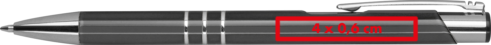 Lackierter Kugelschreiber aus Metall mit 3 Zierringen und blau schreibender Großraummine.Mit unserem vollfarbig lackierten Kugelschreiber aus Metall bieten wir ein elegantes Schreibgerät, das Ihren Anforderungen an Stil und Funktionalität gerecht wird. Produkthighlights: Hochwertiges Metall: Der Kugelschreiber ist aus qualitativ hochwertigem Metall gefertigt, was ihm eine robuste Haltbarkeit und ein edles Aussehen verleiht. Vollfarbige Lackierung: Die vollfarbige Lackierung des Kugelschreibers sorgt für ein ansprechendes und modernes Erscheinungsbild. Drei Zierringe: Die drei Zierringe am Schaft des Kugelschreibers verleihen ihm eine stilvolle Note und eine angenehme Haptik. Blau schreibende Großraummine: Mit einer blau schreibenden Großraummine können Sie flüssig und präzise schreiben. Werbeanbringung: Ihre Logo wird mittels Gravur rechts vom Clip auf den Kugelschreiber angebracht, was ihm eine persönliche Note und einen individuellen Charakter verleiht.
