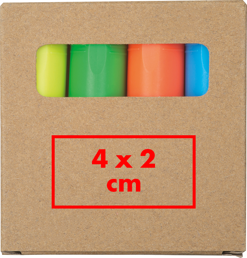 Textmarkerset bestehend aus 4 verschiedenen Farben (gelb, blau, grün und orange), verpackt in einem Karton. Ideal für den Schreibtisch oder die Büchertasche.Unser Textmarker-Set mit vier leuchtenden Farben (Gelb, Blau, Grün und Orange) ist die perfekte Ergänzung für den Schreibtisch oder die Büchertasche. Die Marker sind in einer kompakten Kartonbox verpackt, die für Ordnung sorgt und einfach transportiert werden kann. Dieses praktische Set eignet sich ideal für Schule, Büro oder Studium. Ihre Werbung wird auffällig auf die Box gedruckt und sorgt für eine sichtbare und ansprechende Markenpräsentation. Produkthighlights: Vier leuchtende Farben: Gelb, Blau, Grün und Orange für vielseitige Markierungen. Kompakte Kartonbox: Hält die Marker organisiert und ist leicht zu transportieren. Praktisch und vielseitig: Perfekt für den Einsatz zu Hause, im Büro oder unterwegs. Kompaktes Design: Einfach in der Tasche oder im Rucksack zu verstauen. Werbeanbringung: Ihre Werbung wird auf die Box gedruckt und präsentiert Ihre Marke stilvoll und sichtbar.