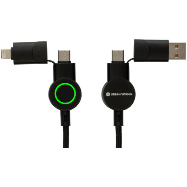 Oakland RCS rKunststoff 1,2m 6-in-1 Fast-Charging 45W KabelDas Gehäuse des Schnellladekabels Oakland besteht aus 100% RCS-zertifiziert recyceltem TPE & Aluminium, das Kabel aus 100% recyceltem TPE-Innen und 100% recycelter PET-Außenschicht. RCS (Recycled Claim Standard) ist ein Standard zur Überprüfung des Recyclinganteils eines Produkts in der gesamten Lieferkette. Dieser Standard wird verwendet, wenn ein Teil des Artikels aus recycelten Materialien hergestellt wurde. 120cm langes Kabel mit 5 verschiedenen Anschlüssen: USB-C In,USB-A In,Typ-C Out,IOS Out und Micro USB Out. Daher auch mit Typ-C Ausgabegeräten verwendbar, wie z.B. neueren Generation von Telefonen und MacBook-Computern. Die USB-A-In/Out-Option sorgt dafür, dass man jedes Gerät von jeder Ausgangsquelle aufladen kann. Maximale Spannung von Typ-C zu Typ-C sind 45W. Urban Vitamin Artikel werden ohne PVC hergestellt. Die Verpackung mit besonders wenig Kunststoff verpackt. Gesamter Recyclinganteil: 52% bezogen auf das Gesamtgewicht des Artikels. Kann Laden und Synchronisieren.