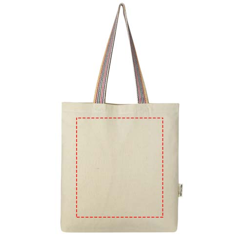 Rainbow 180 g/m² recycelte Tragetasche 5LDie Rainbow Tragetasche mit 180 g/m² ist ein echtes Upgrade zur normalen Baumwolltragetasche. Diese Einkaufstasche aus Recyclingbaumwolle und -polyester ist hergestellt aus Produktionsresten und hat 25 cm lange Tragegriffe aus regenbogenfarbenem Gurtband und eine 3,5 cm breite Standfläche. Sie bietet somit mehr Stauraum. Belastbar bis zu 5 kg.