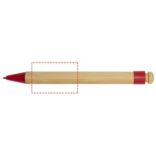 Kugelschreiber mit Clip und Spitze aus recyceltem Kunststoff, Knopf und Schaft aus Bambus. Tintenfarbe: Schwarz. Schreiblänge: 1000 Meter. Schreibspitze: 1,0 mm.
