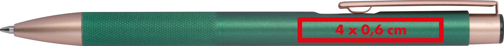 Kugelschreiber aus recyceltem Aluminium mit rosé goldenen Applikationen, blau schreibender Großraummine und Griffzone in Diamantoptik.Unser Kugelschreiber aus recyceltem Aluminium überzeugt durch seine elegante Optik mit rosé goldenen Applikationen und einer Griffzone in edler Diamantoptik. Die blau schreibende Großraummine sorgt für ein angenehmes Schreibgefühl – ideal für den täglichen Einsatz im Büro, unterwegs oder als hochwertiges Werbegeschenk. Ein Statement für Nachhaltigkeit und Stil. Produkthighlights: Recyceltes Aluminium: Umweltbewusst und hochwertig verarbeitet. Rosé goldene Akzente: Für einen besonders eleganten Look. Diamantoptik-Griffzone: Liegt angenehm und sicher in der Hand. Großraummine (blau): Langanhaltend und zuverlässig schreibend. Werbeanbringung: Ihre Werbung gravieren wir präzise rechts vom Clip – so bleibt Ihre Marke bei jedem Schreibmoment stilvoll im Fokus.