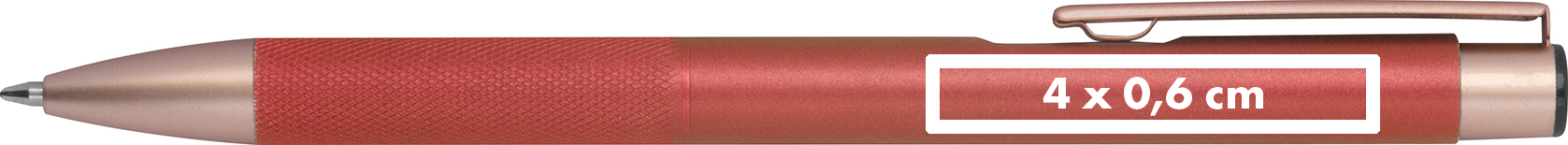 Kugelschreiber aus recyceltem Aluminium mit rosé goldenen Applikationen, blau schreibender Großraummine und Griffzone in Diamantoptik.Unser Kugelschreiber aus recyceltem Aluminium überzeugt durch seine elegante Optik mit rosé goldenen Applikationen und einer Griffzone in edler Diamantoptik. Die blau schreibende Großraummine sorgt für ein angenehmes Schreibgefühl – ideal für den täglichen Einsatz im Büro, unterwegs oder als hochwertiges Werbegeschenk. Ein Statement für Nachhaltigkeit und Stil. Produkthighlights: Recyceltes Aluminium: Umweltbewusst und hochwertig verarbeitet. Rosé goldene Akzente: Für einen besonders eleganten Look. Diamantoptik-Griffzone: Liegt angenehm und sicher in der Hand. Großraummine (blau): Langanhaltend und zuverlässig schreibend. Werbeanbringung: Ihre Werbung gravieren wir präzise rechts vom Clip – so bleibt Ihre Marke bei jedem Schreibmoment stilvoll im Fokus.