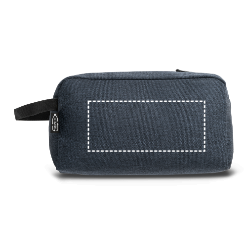Kulturtasche aus Polyester aus recyceltem 600D mit gefuttertem Innenbereich. Vordertasche mit Reißverschluss und seitlicher Schlaufe