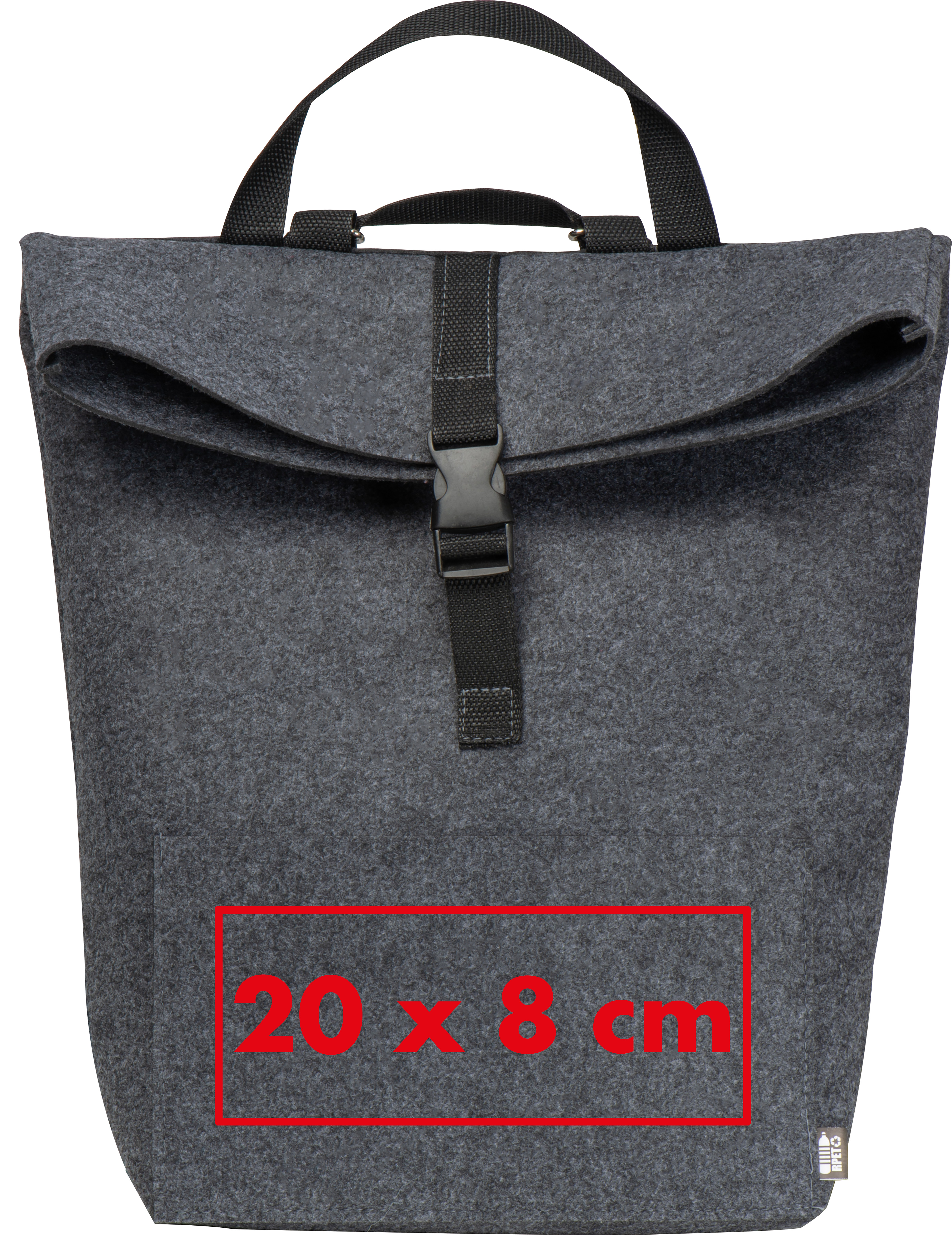 Großer Rucksack aus RPET Filz mit Überschlag und Vorfach.Unser großer Rucksack aus RPET Filz verbindet modernes Design mit praktischer Funktionalität. Der Rucksack verfügt über einen Überschlag, der den Inhalt schützt, und ein geräumiges Vorfach für einfachen Zugriff auf kleinere Gegenstände. Das Material aus recyceltem PET-Flies ist leicht, strapazierfähig und ideal für den täglichen Gebrauch. Ihre individuelle Werbung wird auf das Vorfach gedruckt und präsentiert Ihre Marke stilvoll und sichtbar. Produkthighlights: RPET Filzmaterial: Langlebig und leicht, aus recyceltem Material gefertigt. Geräumiges Hauptfach: Bietet viel Platz für Bücher, Einkäufe oder Arbeitsmaterialien. Überschlag: Schützt den Inhalt und verleiht dem Rucksack eine moderne Optik. Praktisches Vorfach: Ideal für kleinere Gegenstände, die schnell griffbereit sein müssen. Werbeanbringung: Ihre Werbung wird gut sichtbar auf das Vorfach gedruckt und sorgt für eine auffällige Präsentation Ihrer Marke.