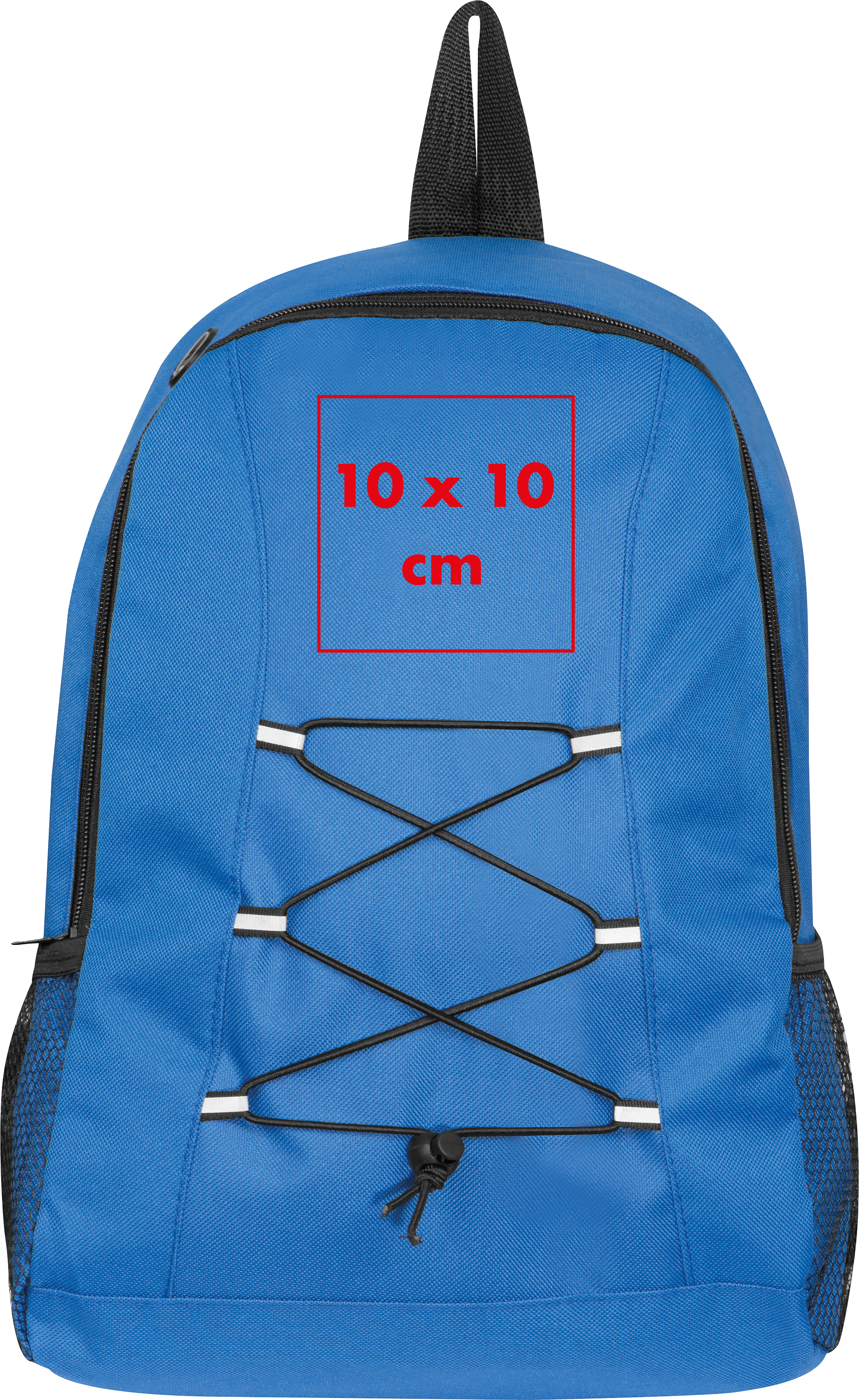 Rucksack aus 600D recyceltem Polyester mit Hängeschlaufe, zwei seitlichen Netztaschen sowie zwei gepolsterten Schultergurten.Unser Rucksack aus 600D recyceltem Polyester bietet eine praktische und strapazierfähige Lösung für den täglichen Einsatz. Mit zwei seitlichen Netztaschen für Trinkflaschen oder kleinere Gegenstände und einer Hängeschlaufe für bequemes Aufhängen ist er ideal für Arbeit, Schule oder Freizeit. Die gepolsterten Schultergurte sorgen für hohen Tragekomfort. Ihre Werbung wird gut sichtbar auf die Vorderseite gedruckt und macht den Rucksack zu einem effektiven und stilvollen Werbeartikel. Produkthighlights: 600D recyceltes Polyester: Strapazierfähiges Material für eine lange Nutzungsdauer. Seitliche Netztaschen: Perfekt für Wasserflaschen, Schirme oder andere Kleinigkeiten. Hängeschlaufe: Praktisch für einfaches Aufhängen an Haken oder Garderoben. Gepolsterte Schultergurte: Bieten Komfort, auch bei längerer Nutzung. Großzügiger Stauraum: Ideal für Bücher, Kleidung oder Arbeitsutensilien. Werbeanbringung: Ihre Werbung wird auf der Vorderseite des Rucksacks gedruckt und sorgt für eine auffällige Markenpräsentation.