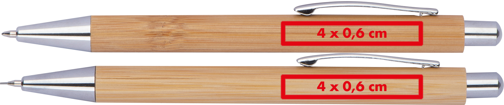 Schreibset bestehend aus einem blau schreibenden Kugelschreiber und einem Druckbleistift aus Bambus mit silbernen Applikationen. Geliefert wird das Set in einer Kartonverpackung.Unser Schreibset aus Bambus kombiniert stilvolle Eleganz mit praktischer Funktionalität. Es besteht aus einem blau schreibenden Kugelschreiber und einem Druckbleistift, beide mit einem Schaft aus Bambus und hochwertigen silbernen Applikationen. Das Set wird in einer schlichten Kartonverpackung geliefert, die das natürliche Design unterstreicht. Ihre Werbung wird rechts vom Clip auf beide Schreibgeräte graviert, um eine dezente und professionelle Präsentation Ihrer Marke zu gewährleisten. Produkthighlights: Bambuskorpus: Natürliches Bambusmaterial für eine hochwertige Haptik und Optik. Silberne Applikationen: Elegante Details, die das Design der Schreibgeräte hervorheben. Präzises Schreiben und Zeichnen: Ideal für Notizen, Skizzen und den täglichen Gebrauch. Kartonverpackung: Praktisch und schlicht, ideal für ein stilvolles Geschenk oder Präsent. Werbeanbringung: Ihr Logo wird rechts vom Clip graviert, für eine langlebige und hochwertige Markenpräsentation.