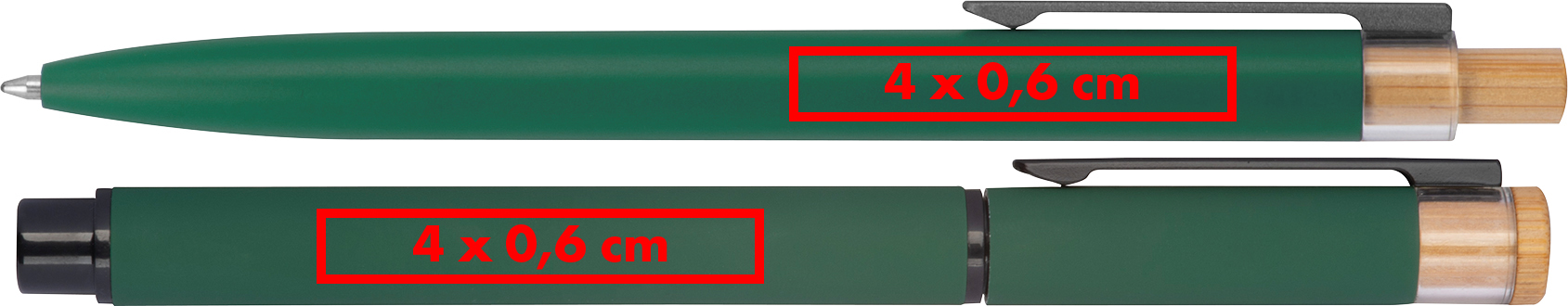 Schreibset bestehend aus einem Kugelschreiber mit blau schreibender Mine und einem Rollerball aus recyceltem Aluminium, mit Metallclip und Bambusdrücker in einer Papierbox. (Gravurpreis für beide Schreibgeräte)Unser hochwertiges Schreibset bietet einen stilvollen Kugelschreiber mit blau schreibender Mine und einen präzisen Rollerball, beide gefertigt aus recyceltem Aluminium. Diese eleganten Schreibgeräte bestechen durch ihr modernes Design mit Metallclip und Bambusdrücker. Verpackt in einer schlichten Papierbox, ist das Set ideal als Geschenk oder für den täglichen Gebrauch. Ihre Gravur rechts vom Clip auf beiden Schreibgeräten verleiht dem Set eine dezente und edle Markenpräsentation. Der angegebene Preis umfasst die Gravur für beide Schreibgeräte. Produkthighlights: Kugelschreiber: Flüssiges Schreiben mit blauer Mine, ideal für den Alltag. Rollerball: Präzises und angenehmes Schreiben, auch für längere Texte geeignet. Material aus recyceltem Aluminium: Robust, langlebig und mit zeitgemäßer Optik. Bambusdrücker und Metallclip: Stilvolle Details, die das Design aufwerten. Papierbox: Dezente und passende Verpackung, ideal für Geschenke oder Präsentationen. Werbeanbringung: Ihre Gravur wird rechts vom Clip auf beiden Schreibgeräten angebracht, für eine elegante und hochwertige Markenpräsentation.
