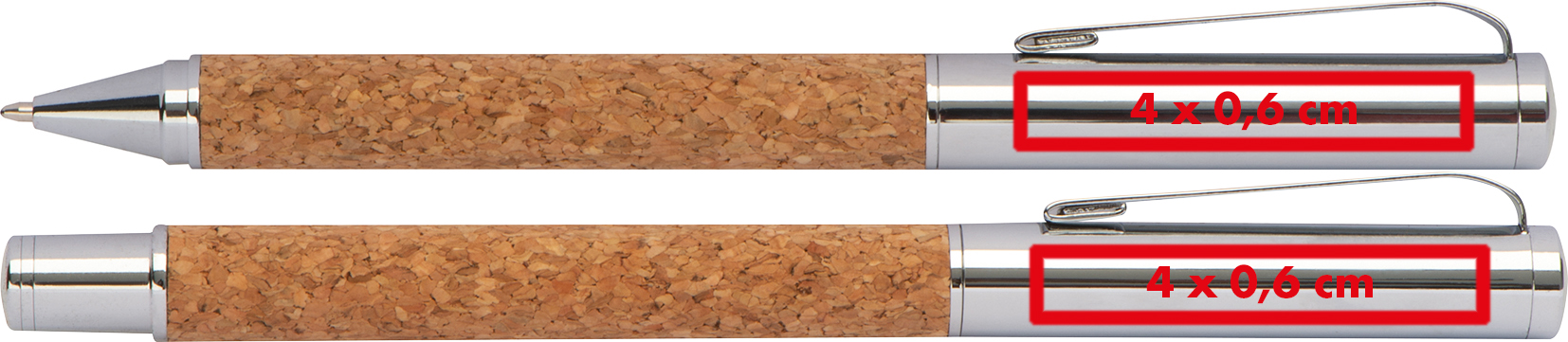Metall Schreibset mit Korkummantelung bestehend aus einem Drehkugelschreiber mit blau schreibender Großraummine und einem Rollerball. Geliefert werden die Schreibgeräte in einer Box aus Kork.Das Metall-Schreibset mit Korkummantelung ist eine elegante Wahl für ein hochwertiges Geschenk. Es umfasst einen Drehkugelschreiber mit Großraummine und einen Rollerball, beide mit einer edlen Korkummantelung. Die Schreibgeräte werden in einer Box aus Kork geliefert, und Ihre Werbung wird rechts vom Clip beider Schreibgeräte gelasert. Die Laserkosten gelten für beide Schreibgeräte. Produkthighlights: Hochwertige Metallschreibgeräte: Die Kugelschreiber und Rollerball sind mit Metall gefertigt, was ihnen ein hochwertiges und langlebiges Design verleiht. Korkummantelung: Die Korkummantelung der Schreibgeräte verleiht ihnen eine natürliche und warme Optik, die sich angenehm anfühlt. Box aus Kork: Die Schreibgeräte werden in einer Box aus Kork geliefert, die nicht nur eine stilvolle Präsentation ermöglicht, sondern sie auch schützt. Werbeanbringung: Ihre Werbung wird rechts vom Clip beider Schreibgeräte gelasert, was eine dauerhafte und elegante Präsentation Ihrer Marke sicherstellt.