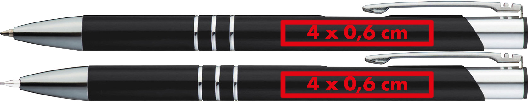 Schreibset aus Metall, bestehend aus einem Kugelschreiber mit blau schreibender Großraummine und einem Druckbleistift mit je 3 Zierringen. Der Gravurpreis versteht sich für beide Schreibgeräte.Unser Schreibset aus Metall besteht aus einem Kugelschreiber mit blau schreibender Großraummine und einem Druckbleistift, jeweils mit 3 Zierringen für eine elegante Optik. Ihre Werbung wird rechts vom Clip des Kugelschreibers gelasert, und der Gravurpreis gilt für beide Schreibgeräte. Produkthighlights: Hochwertiges Metall: Beide Schreibgeräte sind aus Metall gefertigt und bieten eine edle Optik sowie Langlebigkeit. Blauschreibende Großraummine: Der Kugelschreiber verfügt über eine blaue Großraummine, die für ein geschmeidiges Schreiberlebnis und klare Schrift sorgt. Druckbleistift: Der Druckbleistift ist eine praktische Ergänzung und ideal für Skizzen und technische Zeichnungen. Zierringe: Die 3 Zierringe an beiden Schreibgeräten verleihen ihnen eine elegante und stilvolle Optik. Werbeanbringung: Ihre Werbung wird rechts vom Clip des Kugelschreibers gelasert, um sicherzustellen, dass Ihre Marke stilvoll und dauerhaft präsentiert wird.