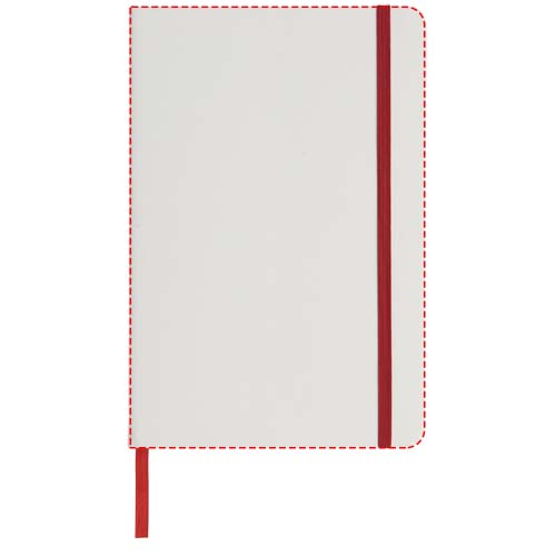 Weißes A5 Notizbuch mit farbigem Gummizug und Lesebändchen. Enthält 80 Blatt (60 g/m²) liniertes Papier.