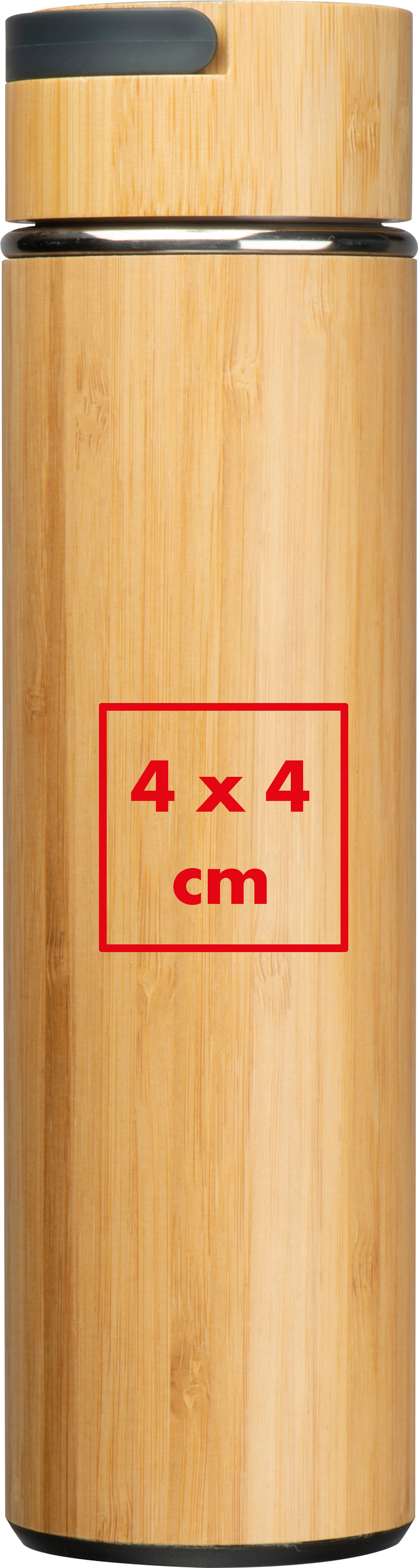Doppelwandige Edelstahltrinkflasche mit Teesieb, Bambusummantelung, einem Füllvermögen von 500ml und einem Tragehenkel im Deckel.Unsere doppelwandige Edelstahltrinkflasche mit Bambusakzenten kombiniert Funktionalität und Stil in einem hochwertigen Design. Mit einem Fassungsvermögen von 500 ml, einem integrierten Teesieb und einem praktischen Tragehenkel ist sie der ideale Begleiter für den Alltag. Ihre Werbung wird durch eine präzise Gravur auf der Flasche sichtbar gemacht und verleiht ihr eine persönliche Note. Produkthighlights: Doppelwandiges Edelstahl-Design: Hält Getränke stundenlang heiß oder kalt und verhindert Kondensation an der Außenfläche. Bambusdeckel: Verleiht der Flasche eine natürliche Optik und unterstreicht ihre edle Verarbeitung. Integriertes Teesieb: Ideal, um Tee oder infused Drinks direkt in der Flasche zuzubereiten. Praktischer Tragehenkel: Erleichtert den Transport und macht die Flasche zum perfekten Begleiter für unterwegs. Werbeanbringung: Ihr Logo wird präzise auf die Flasche graviert und sorgt für eine hochwertige Markenpräsentation.