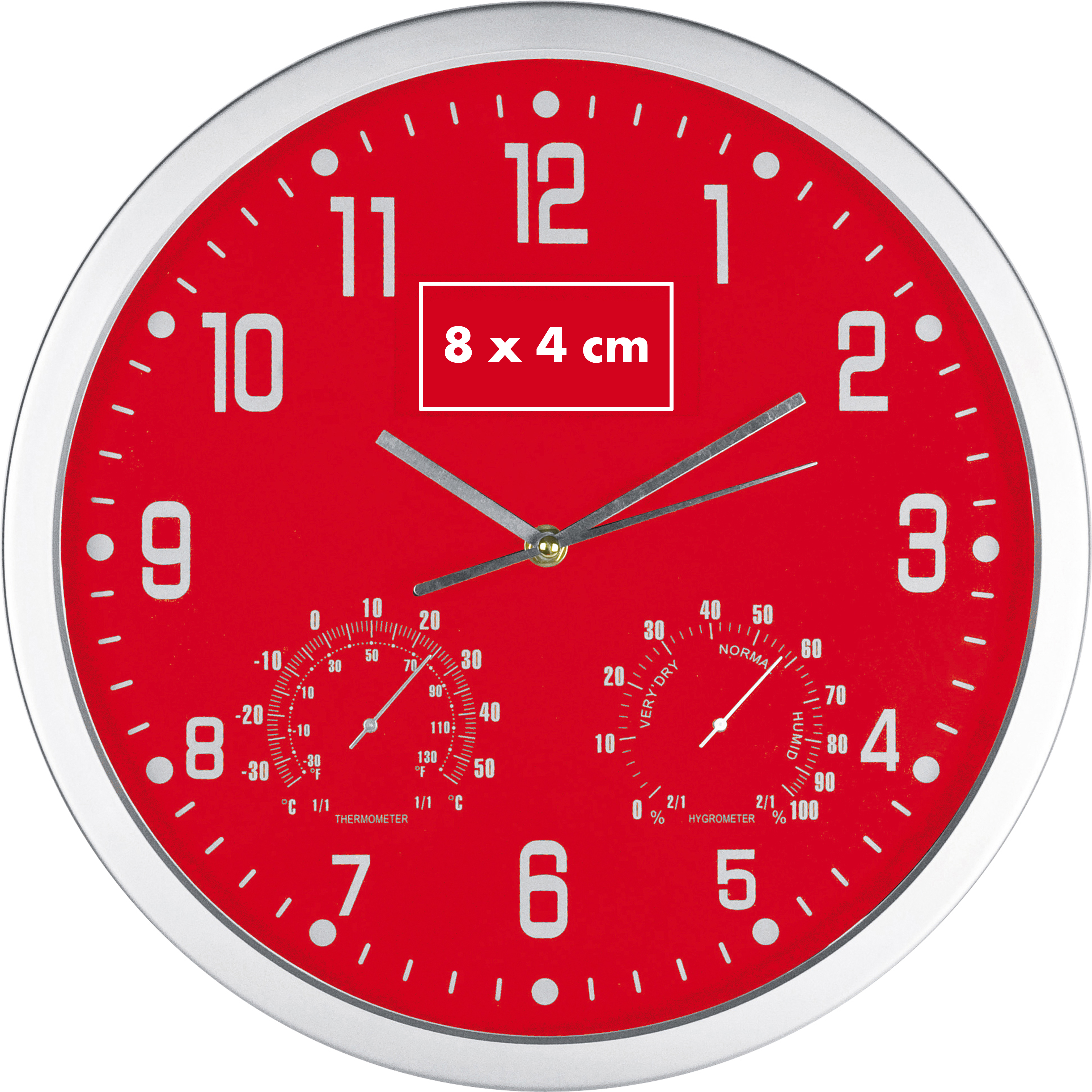 Schick und schlicht - somit ideal.Unsere schicke und schlichte Wanduhr mit integriertem Hygrometer und Thermometer ist die perfekte Leinwand für Ihre Werbung. Diese Uhr ist nicht nur funktional, sondern auch äußerst dekorativ und wird sicherlich in verschiedenen Umgebungen Aufmerksamkeit erregen. Produkthighlights: Zeit, Temperatur und Luftfeuchtigkeit: Die Uhr verfügt über ein präzises Uhrwerk, ein Thermometer zur Anzeige der Raumtemperatur und ein Hygrometer zur Messung der Luftfeuchtigkeit, was sie zu einem nützlichen und informativen Accessoire macht. Schickes Design: Die schlichte und elegante Gestaltung der Uhr passt zu einer Vielzahl von Einrichtungsstilen und Räumen, sei es im Büro, im Wohnzimmer oder anderswo. Hochwertige Verarbeitung: Die Uhr ist aus hochwertigen Materialien gefertigt und verfügt über leise Uhrwerke, die störende Geräusche vermeiden. Vielseitige Verwendung: Diese Uhr eignet sich sowohl als stilvolle Wanduhr als auch als Werbemittel, um Ihre Marke zu bewerben. Werbeanbringung: Ihre Werbung wird auf dem Werbeplättchen unterhalb der Zwölf platziert, was eine zentrale und auffällige Position ist.