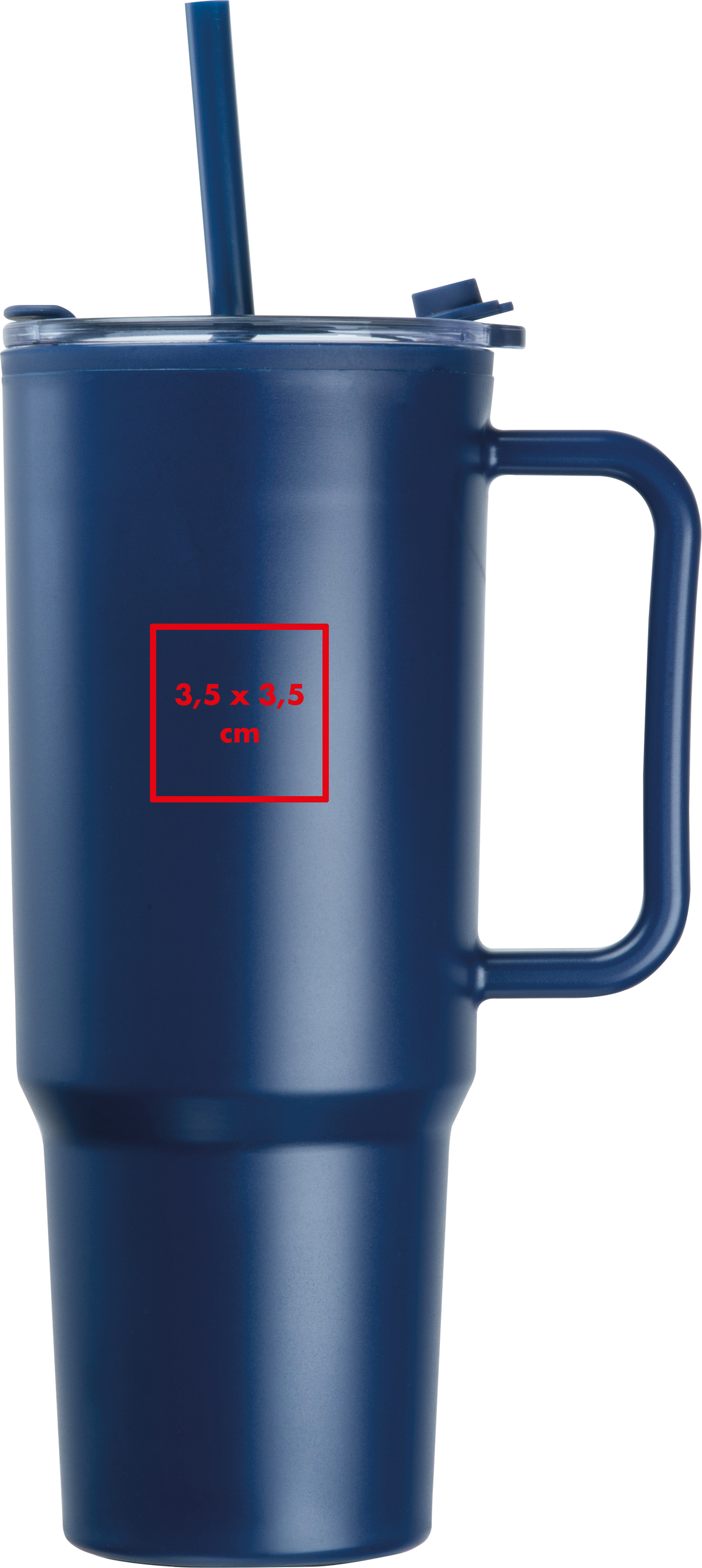 Doppelwandiger XXL-Trinkbecher aus BPA-freiem Kunststoff mit einem Füllvermögen von 1200ml, praktischem Tragegriff und herausnehmbarem Strohhalm im Deckel.