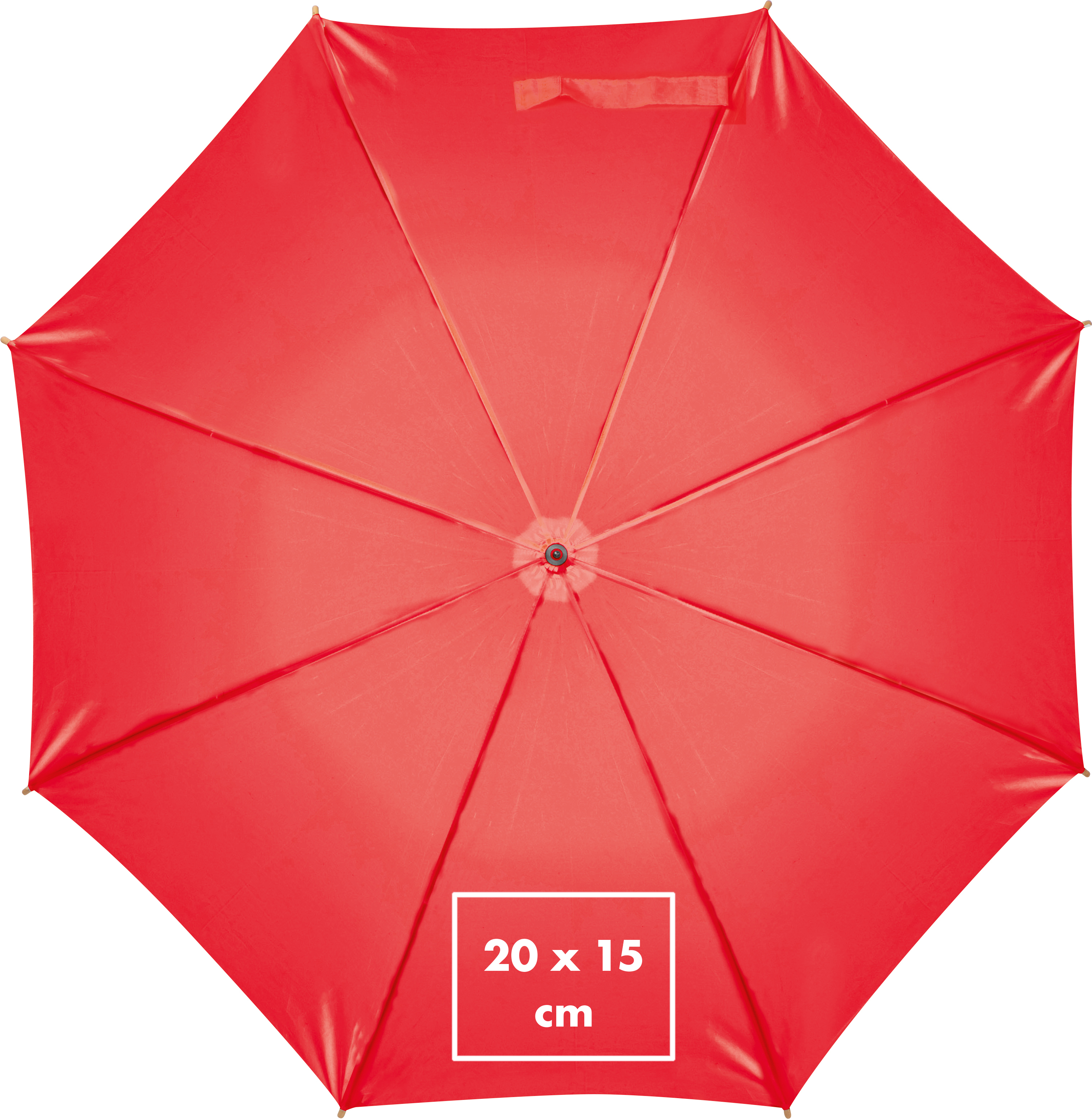 Automatik Regenschirm aus 190T Polyester mit gebogenem Holzgriff und Holzspitzen.