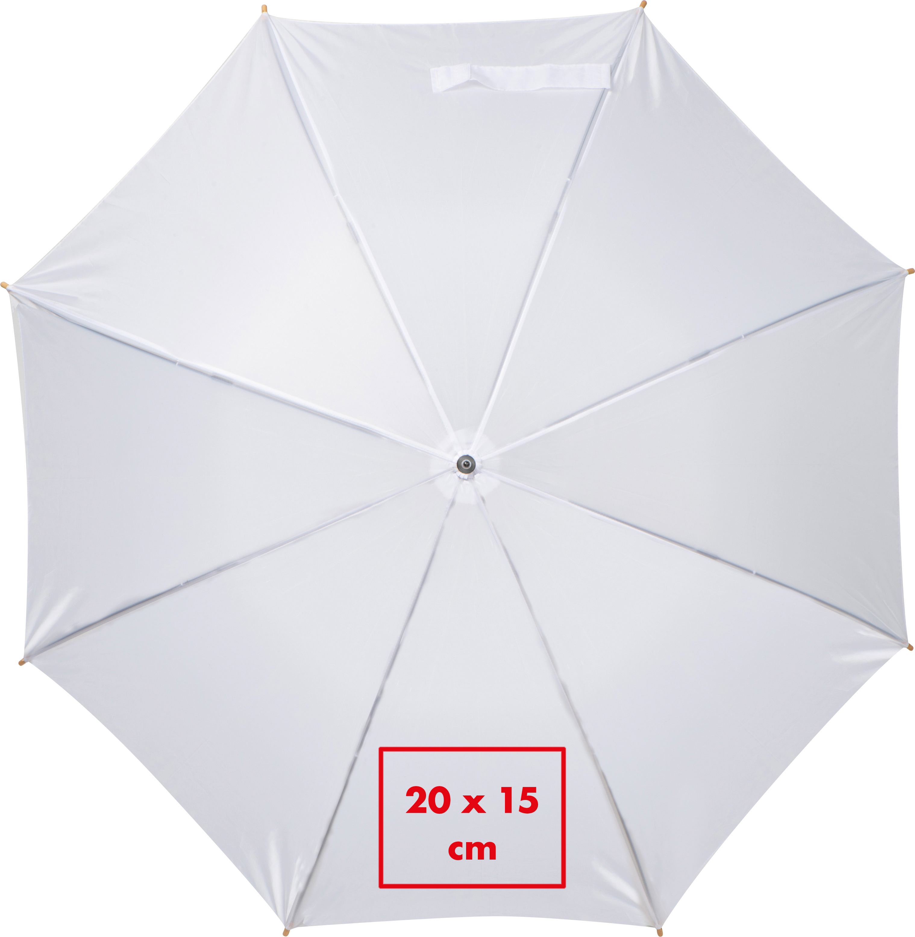 Automatik Regenschirm aus 190T Polyester mit gebogenem Holzgriff und Holzspitzen.