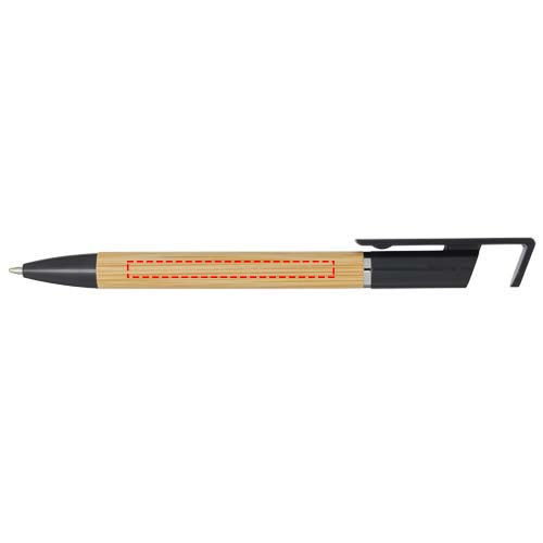 Delfina Stift Smartphoneständer (blaue Mine)Bamboo-Kugelschreiber, der auch als Telefonhalterung fungiert. Der Knopf und der Mittelring bestehen aus recyceltem Kunststoff, die Spitze aus Messing und der Schaft aus nachhaltig angebautem Bambus. Tintenfarbe: Blau. Schreiblänge: 1000 Meter. Strichstärke: 1,0 mm.