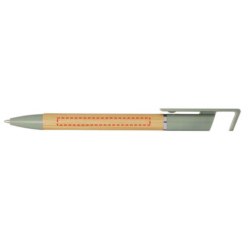 Delfina Stift Smartphoneständer (schwarze Mine)Bamboo-Kugelschreiber, der auch als Telefonhalterung fungiert. Der Knopf und der Mittelring bestehen aus recyceltem Kunststoff, die Spitze aus Messing und der Schaft aus nachhaltig angebautem Bambus. Tintenfarbe: Schwarz. Schreiblänge: 1000 Meter. Strichstärke: 1,0 mm.