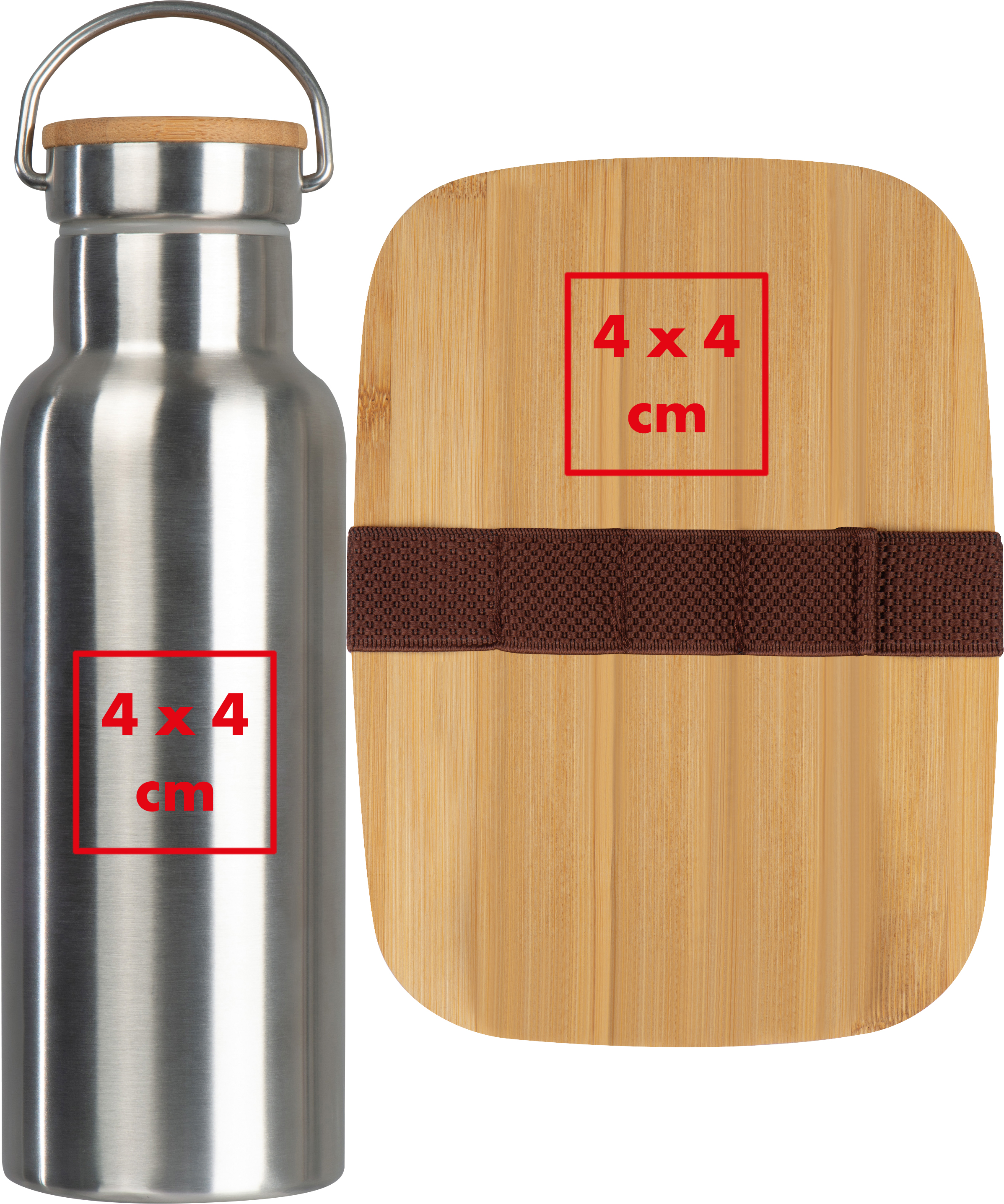 Geschenkset in einer Kartonverpackung, bestehend aus einer Brotzeitbox aus Aluminium mit verschließbarem Bambusdeckel, einer Kühltasche aus Polyester und Kork und einer Trinkflasche aus Edelstahl mit einem Füllvermögen von 500ml.Unser Geschenkset ist nicht nur eine großartige Geschenkidee, sondern verbindet Funktionalität und Stil in einem durchdachten Set. Dieses Set besteht aus einer Brotzeitbox mit einem verschließbaren Bambusdeckel, einer Kühltasche aus Jute und einer Trinkflasche aus Edelstahl. Produkthighlights: Hochwertige Materialien: Die Brotzeitbox verfügt über einen Bambusdeckel, die Kühltasche besteht aus robustem Jutegewebe, und die Trinkflasche ist aus langlebigem Edelstahl gefertigt. Praktische Kombination: Dieses Set bietet alles, was Sie für Ihre Mahlzeiten unterwegs benötigen, und hält Ihre Speisen und Getränke frisch. Werbeanbringung: Wir bieten die Möglichkeit, Ihr Logo auf die Brotzeitbox und die Trinkflasche zu gravieren, um sie zu individuellen Werbemitteln zu machen.