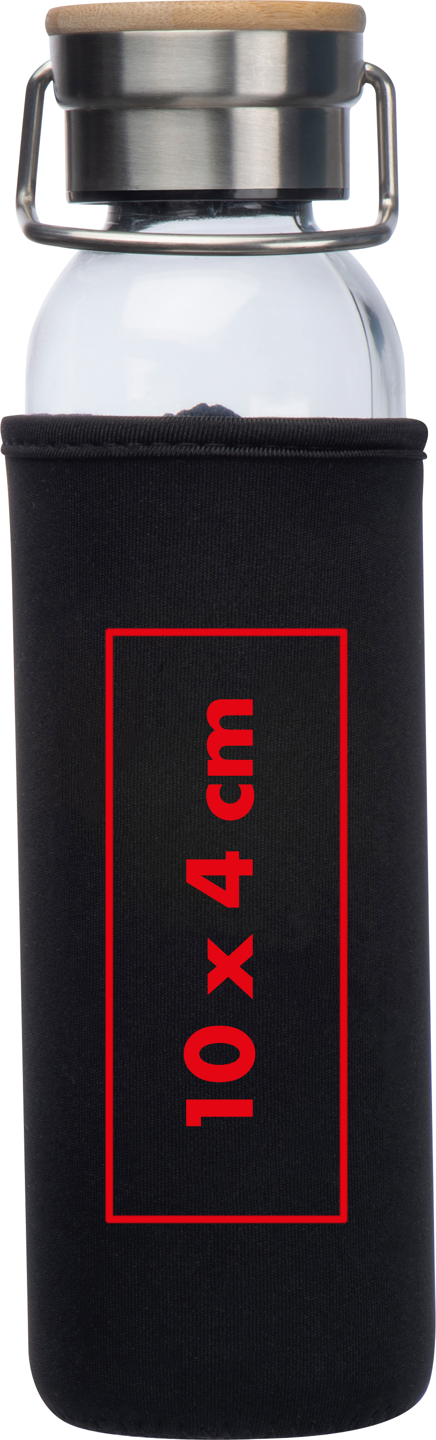 Trinkflasche aus Glas mit Neoprenüberzug, Edelstahldeckel mit Bambusoberteil, Tragehenkel und einem Füllvermögen von 600ml.Unsere Glas-Trinkflasche mit Neoprenüberzug vereint modernes Design mit praktischen Features für unterwegs. Mit einem Fassungsvermögen von 600 ml, einem schützenden Neoprenüberzug und einem Edelstahldeckel mit Bambusakzent ist diese Flasche ein stilvoller Begleiter für jeden Tag. Ihr Logo wird auf den Neoprenüberzug gedruckt und sorgt für eine klare und sichtbare Markenpräsentation. Produkthighlights: Hochwertiges Glas: Geschmacksneutral und ideal für eine reine, unverfälschte Trinkqualität. Schützender Neoprenüberzug: Bietet zusätzlichen Schutz, hält Getränke länger kühl oder warm und verleiht der Flasche eine moderne Optik. Edelstahldeckel mit Bambusakzent: Kombiniert Funktionalität mit einem ansprechenden Design. Praktischer Tragehenkel: Für einfachen Transport, egal ob in der Hand oder befestigt an einer Tasche. Werbeanbringung: Ihr Logo wird auf den Neoprenüberzug gedruckt, für eine stilvolle und dauerhafte Präsentation Ihrer Marke.