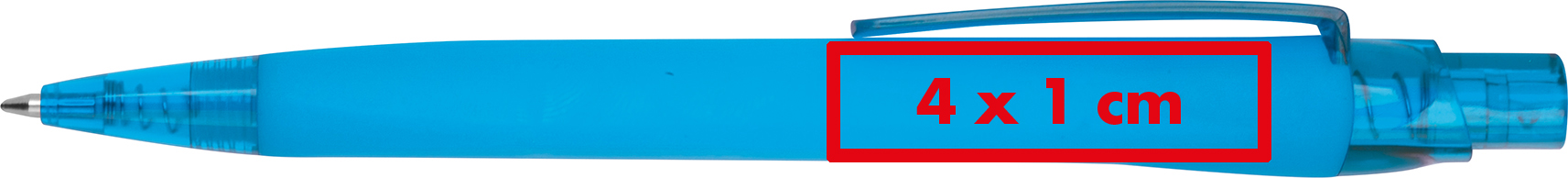 Gummierter Kugelschreiber aus Kunststoff mit blau schreibender Großraummine (Schreiblänge ca. 800m).