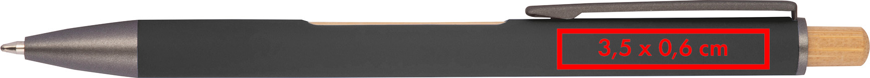 Kugelschreiber aus recyceltem Aluminium mit schwarzem Metallclip, blau schreibender Mine, Bambusdrücker und 6-fach wechselndem Bambusfenster auf Höhe des Clips.Unser Kugelschreiber aus recyceltem Aluminium verbindet modernes Design mit funktionalen Details und natürlichen Akzenten. Mit einem schwarzen Metallclip, einem eleganten Bambusdrücker und einem auffälligen, 6-fach wechselnden Bambusfenster nahe des Clips, bietet dieser Stift nicht nur Komfort, sondern auch ein stilvolles Erscheinungsbild. Die blau schreibende Mine sorgt für ein angenehmes und flüssiges Schreibgefühl. Ihre Werbung wird neben dem Clip graviert, auf Wunsch auch auf die Bambusfläche. Produkthighlights: Recyceltes Aluminium: Robust und hochwertig mit moderner Optik. Schwarzer Metallclip: Stilvoll und langlebig, für eine sichere Befestigung. Bambusdrücker und 6-fach wechselndes Bambusfenster: Natürliche Akzente für ein außergewöhnliches Design. Blau schreibende Mine: Für flüssiges und komfortables Schreiben. Werbeanbringung: Ihre Werbung wird standardmäßig neben dem Clip graviert; Gravur auf die Bambusfläche auf Anfrage möglich.